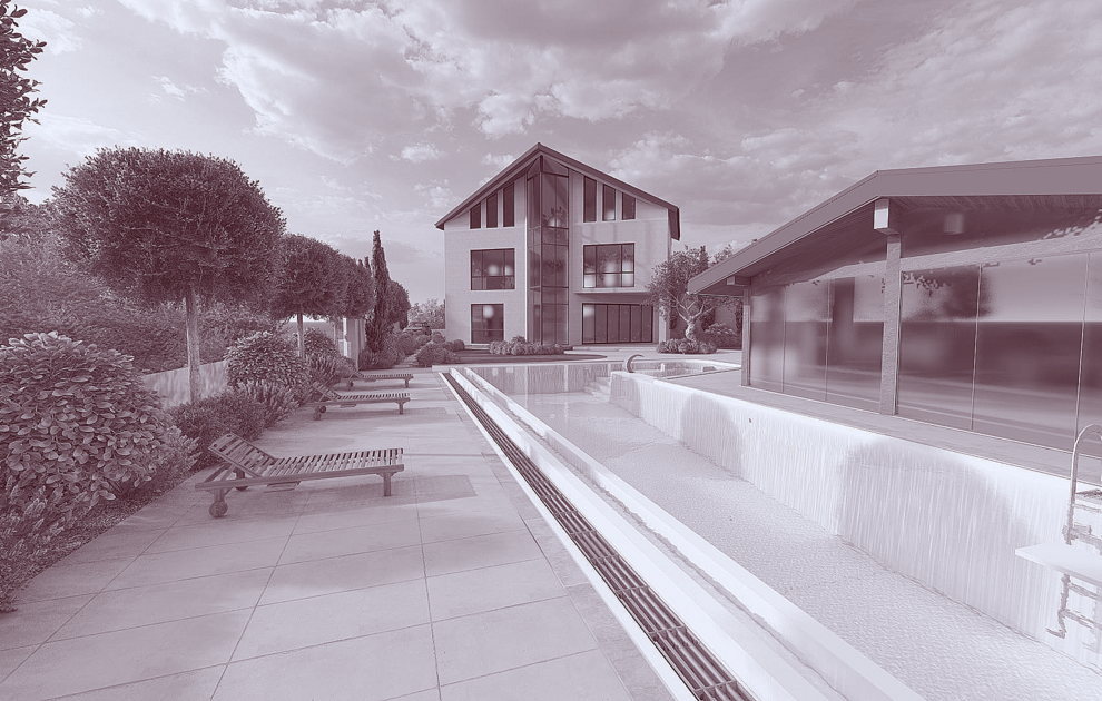 * Адаптация под рельеф. На склоне бетонный бассейн можно вписать в террасу: одна стена — подпорная, вторая — с панорамным остеклением на море.